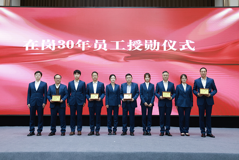 此次大會,還舉行了冶金物資榮耀在崗30年紀念章授勛儀式。由公司新入職的五名員工代表向前輩獻上象征著榮譽與傳承的勛章。